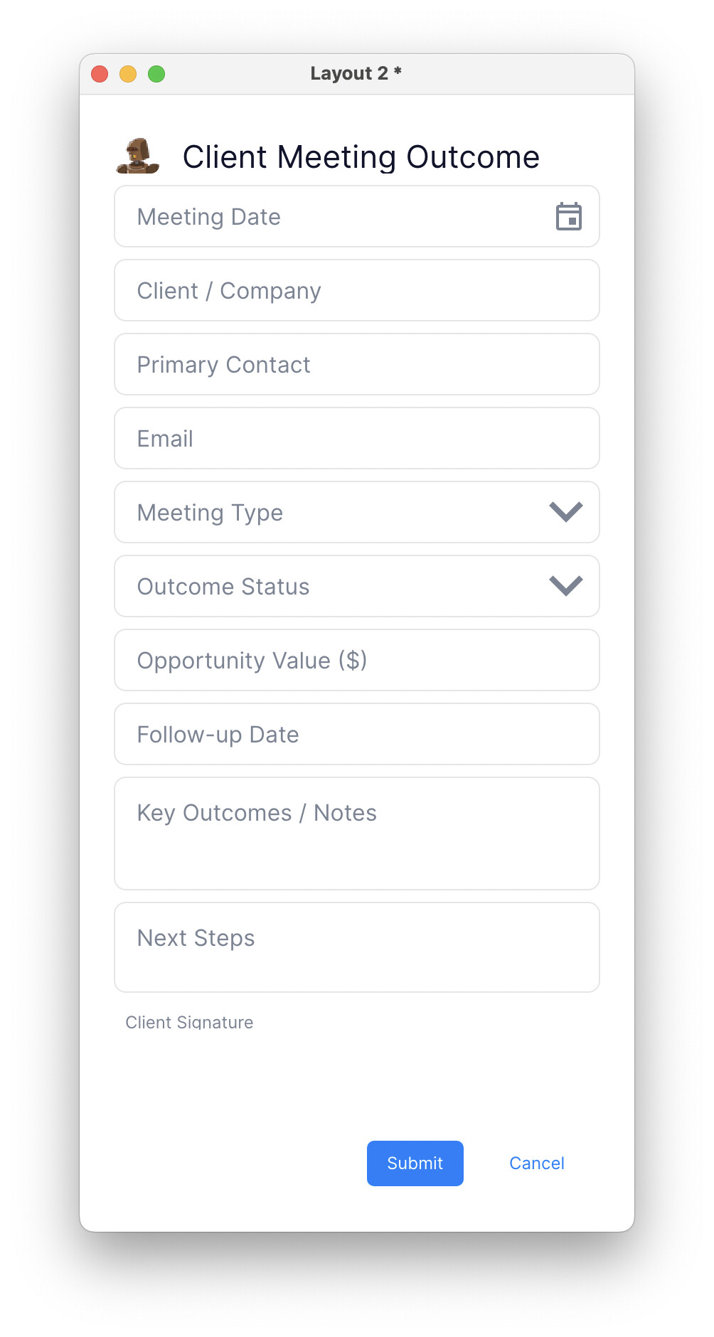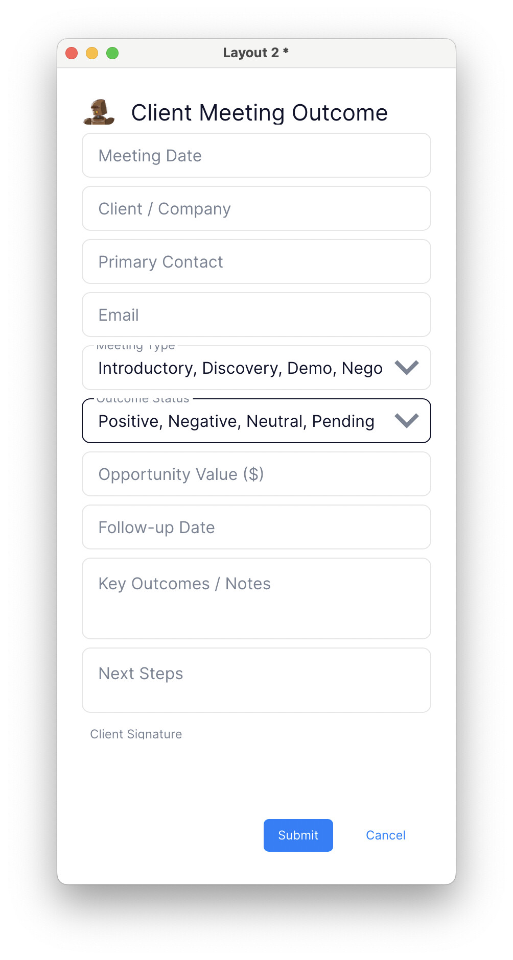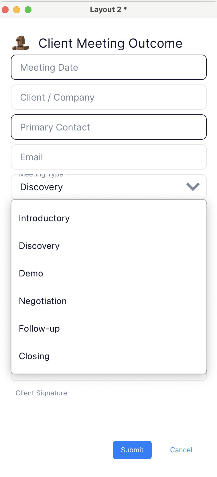 Please insert a calendar icon at the end of the Meeting Date field in Layout 2. Make it visible and about the same size and placement as the down arrow icon in the Meeting Type field.
