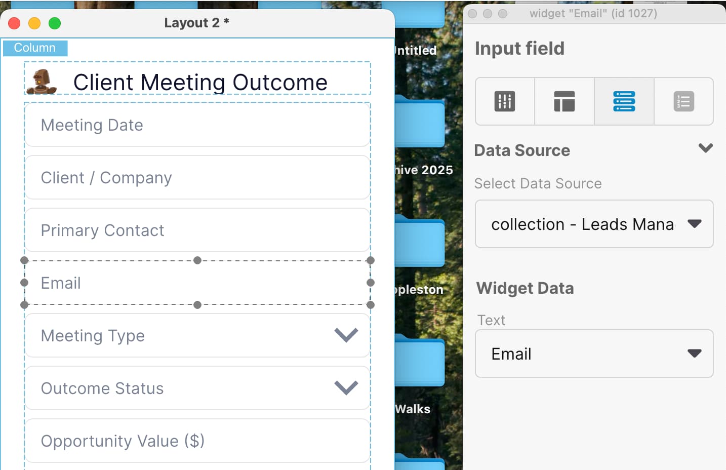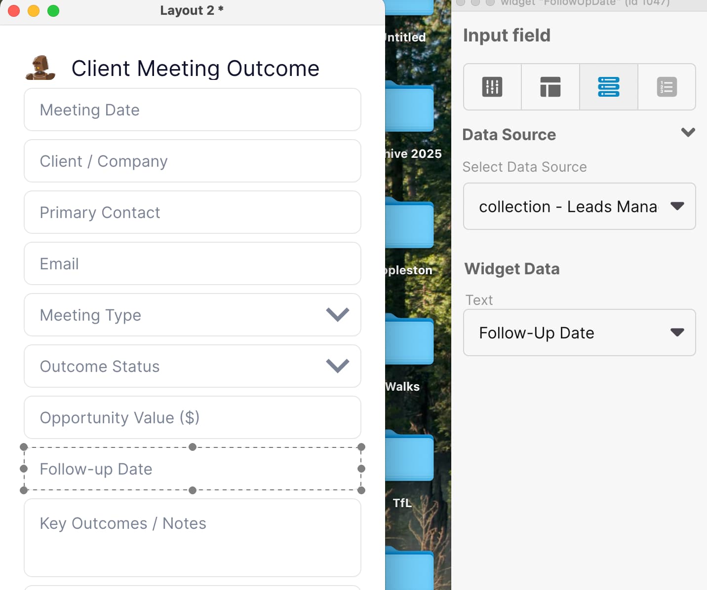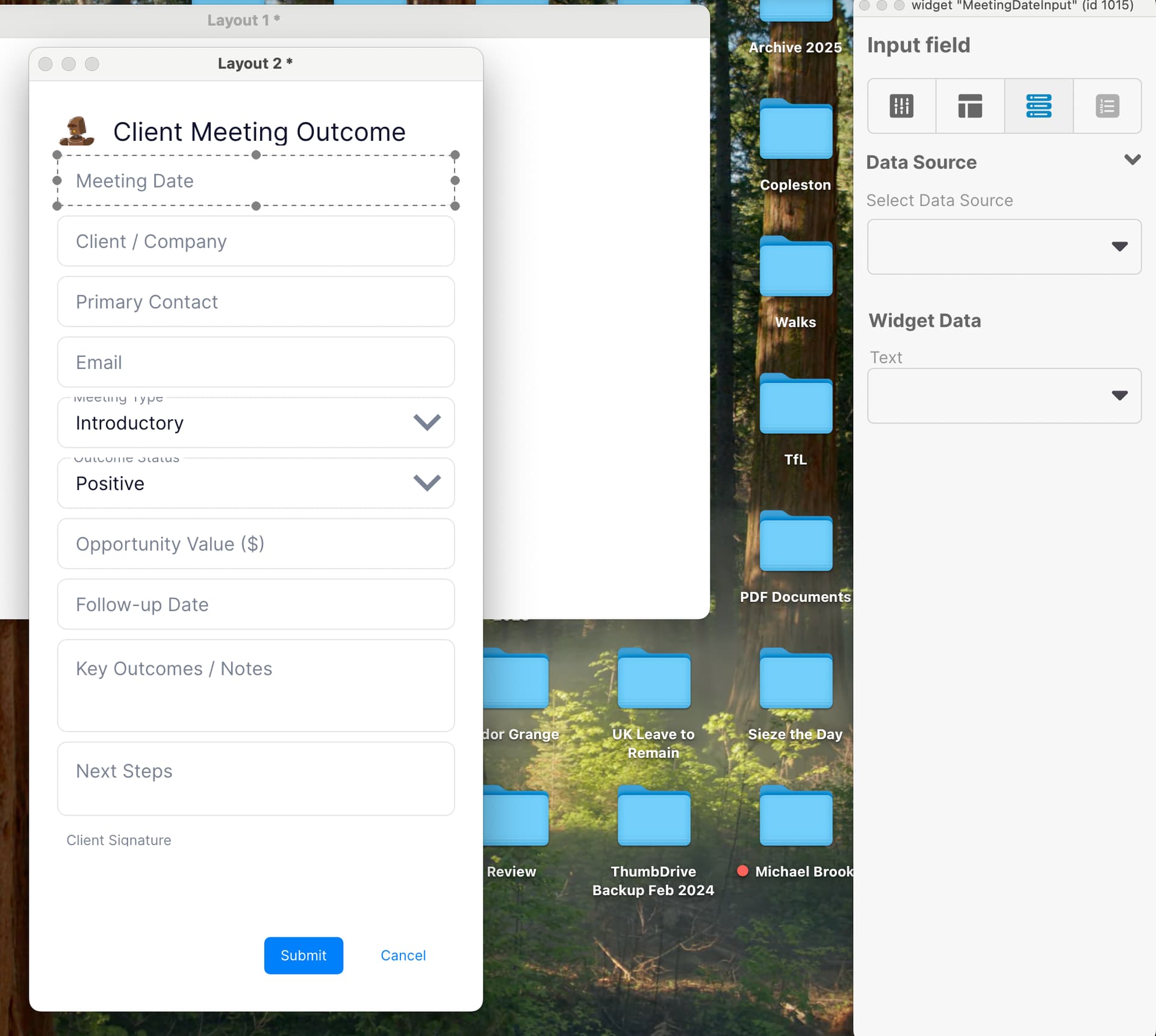 Yes — I’ll make that change. I’ll assume you’re editing a LiveCode Create layout (Layout 2) and that “Meeting Date” and “Meeting Type” are widgets on the same layout; if that’s not correct tell me and I’ll adjust. Here’s a minimal LiveCode script you can run from the card/script or an administration handler to add a calendar icon to the Meeting Date field, size it to ~1/2 inch (use the current screen DPI conversion), center it vertically and right‑justify it inside the field, and match the down arrow placement for Meeting Type.